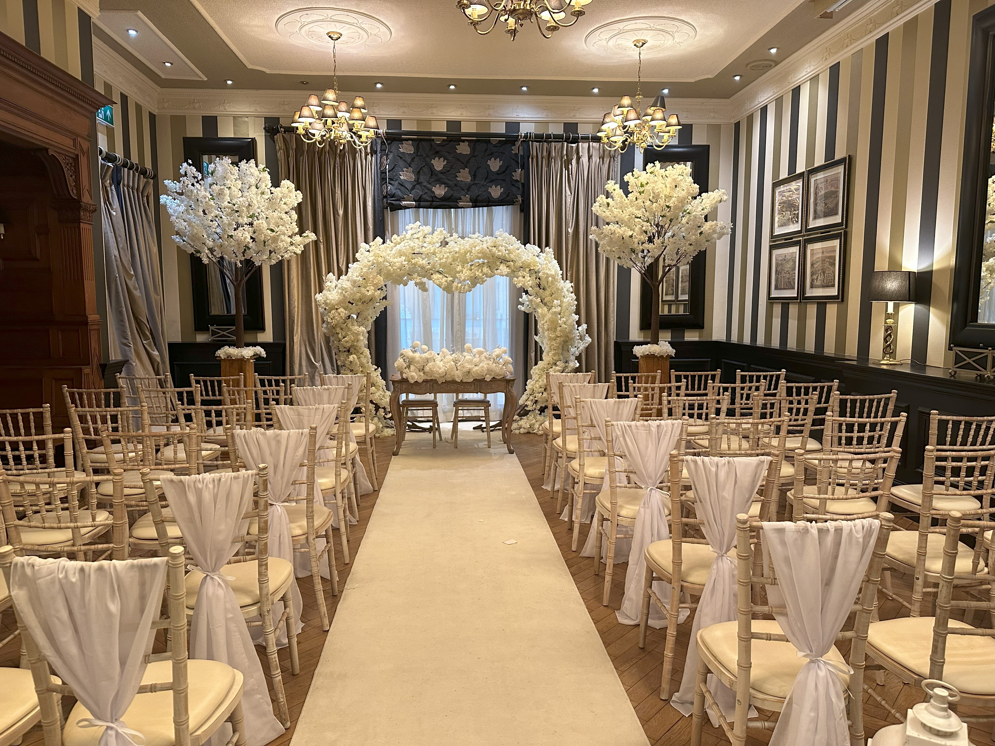 Our 8ft Tall and Full Green foliage & White Rose Arch is a stunning backdrop for any Wedding Ceremony and Wedding Breakfast. It looks real and is full on both sides, so can be free-standing anywhere.